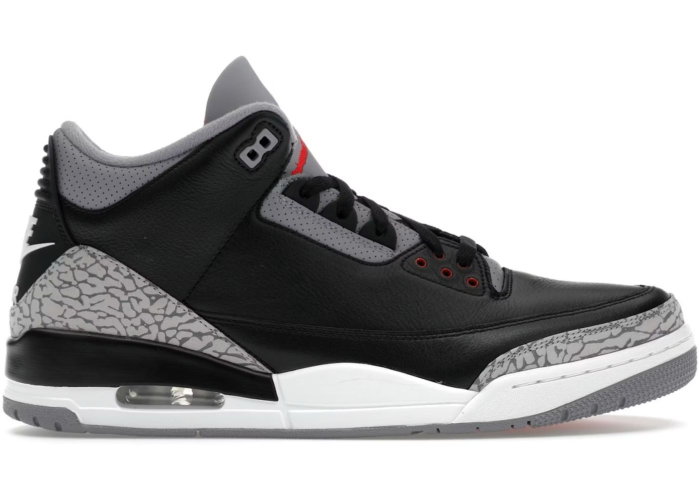 Las Air Jordan 3 Retro Black Cement presentan un upper de cuero premium negro con el icónico elephant print en gris cemento en puntera y talón, más detalles en Fire Red en el Jumpman de la lengüeta y logo Nike Air visible en el talón para un diseño legendario de 1988.